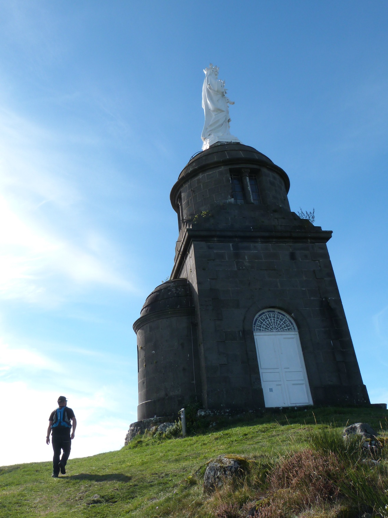 La petite chapelle est fermée mais on devine par l’interstice de la porte qu’elle est régulièrement utilisée. La vue est évidemment imprenable sur l’Artense et sur le Sancy (légèrement coiffé de nuages ce jour-là) et je regrette que les couleurs d’automne ne soient pas plus prononcées en cette fin septembre.