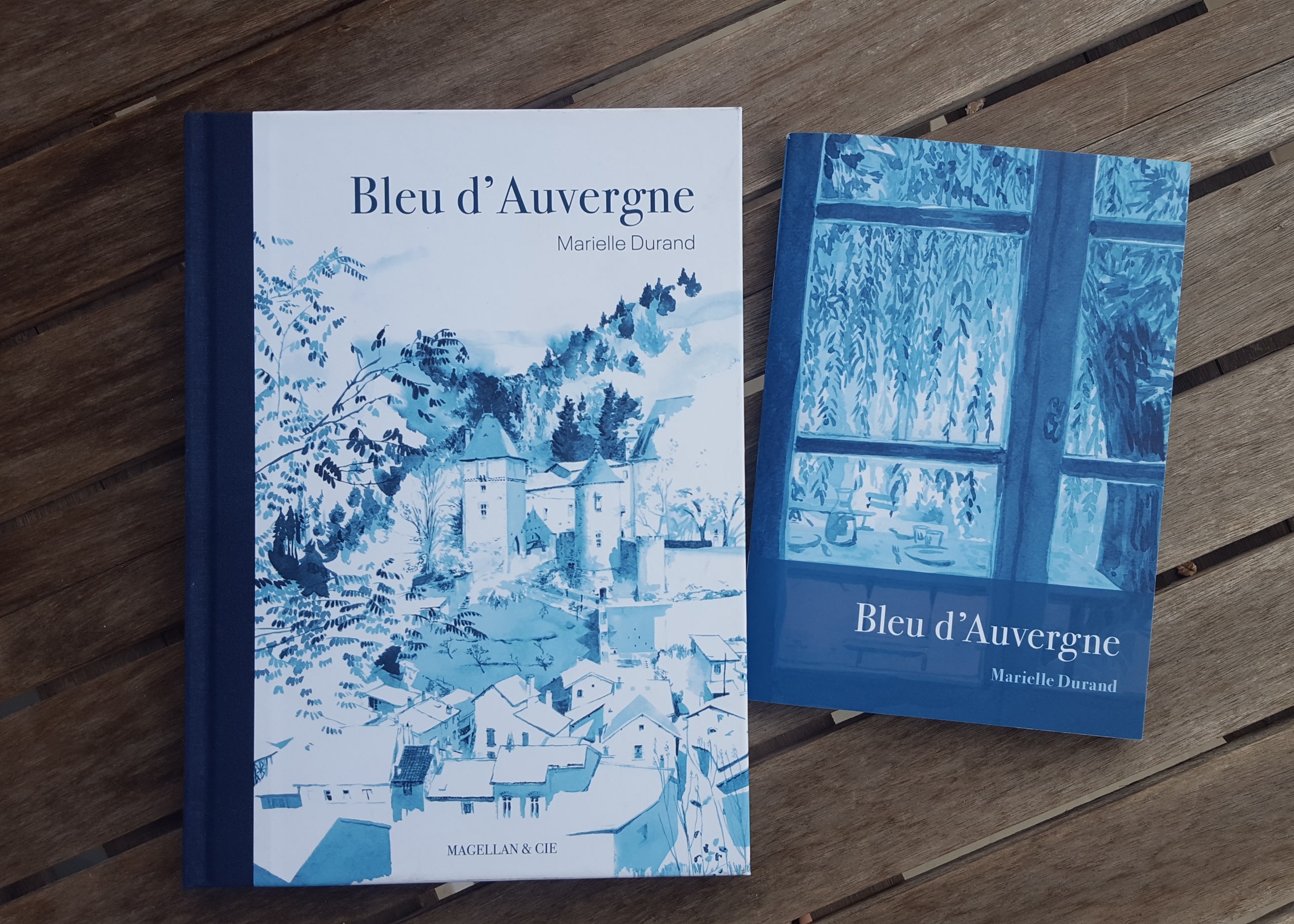 Une première mini-édition de ce Bleu d’Auvergne avait vu le jour juste après la résidence et j’avais eu la chance de mettre la main sur un exemplaire (de la 2e édition tirée à 300 ex.). Un format mini auto-édité qui avait le mérite d’exister mais qui ne rendait pas justice aux mille et une nuances de bleu comme le fait cette superbe édition chez Magellan & Cie, sortie en février. Ce bel ouvrage relié reprend évidemment les notes et dessins de Marielle, mais aussi de nouveaux dessins réalisés lors de séjours en Auvergne en 2019, ou ailleurs. La taille du livre, la texture du papier, la qualité de l’impression donnent l’illusion d’avoir sous les yeux les originaux et je ne me lasse pas de ce talent à saisir les détails et nuances de lumières avec une seule teinte.