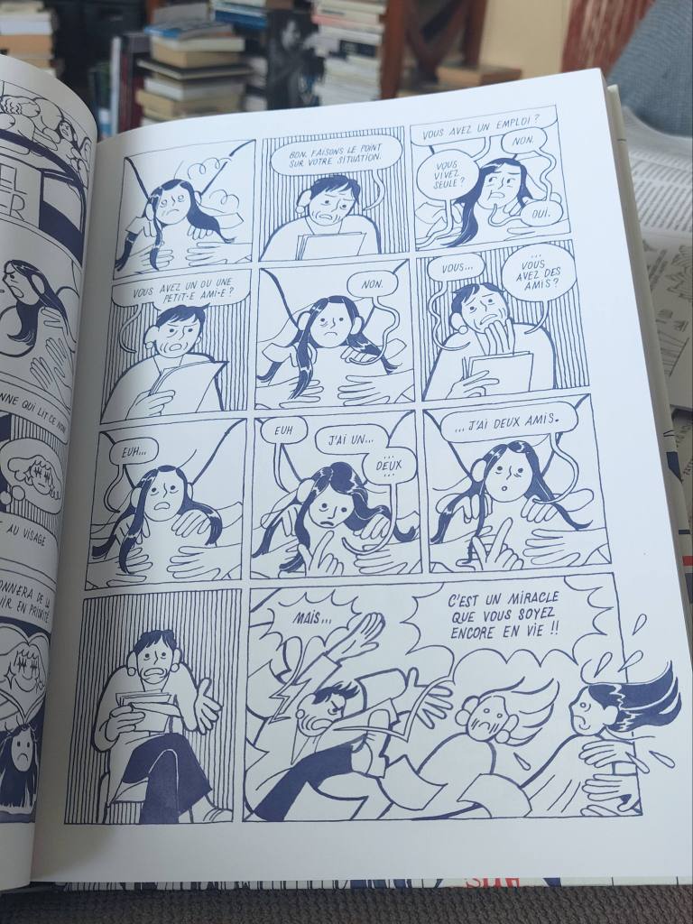 Cette fable dystopique fait évidemment écho aux dérives de notre société de l’hyper-attention, où il faut se montrer, communiquer, faire le buzz, même bad, pour exister et ne pas sombrer dans l’oubli collectif. Beaucoup d’idées intéressantes sont évoquées dans cette BD, comme la différence de temporalité, l’addiction, la violence des mots et des actes lorsque quelqu’un veut vous empêcher d’atteindre votre but… Je regrette un peu que ça n’ait pas été creusé un peu plus car il y a une belle matière à réflexion, mais la lecture de cette histoire laisse un sentiment de vertige, de tourbillon, particulièrement persistant. Le grand vide n’est finalement pas où on le croyait au départ.