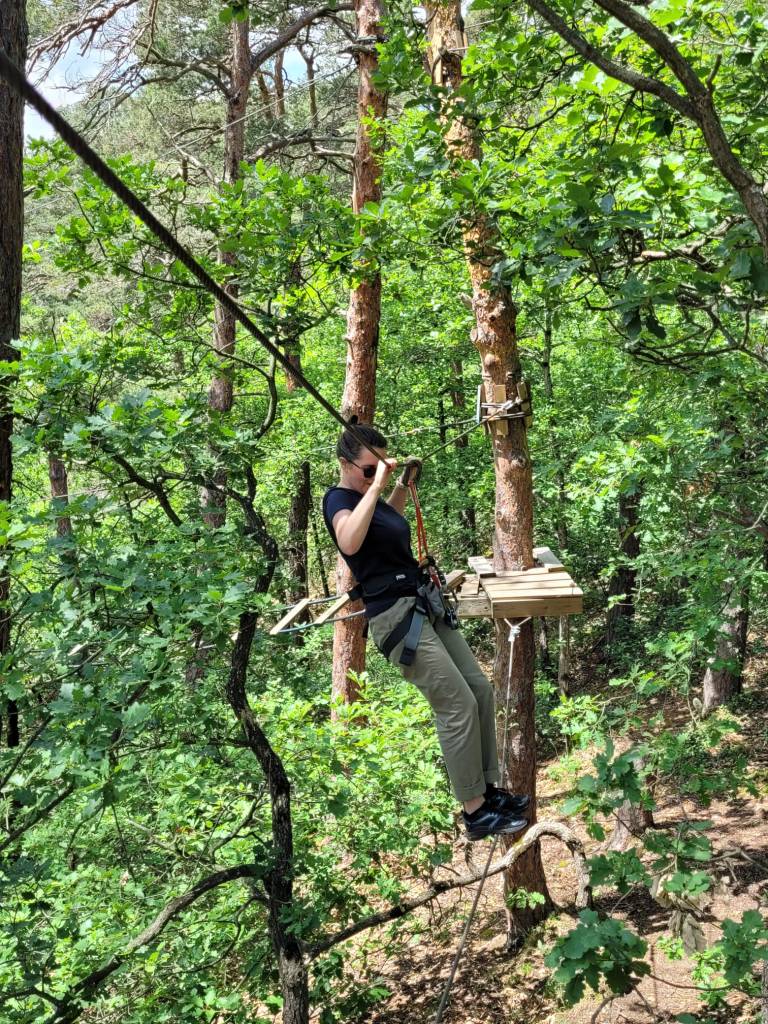 Les petits et grands aventuriers pourront choisir entre plusieurs niveaux de difficulté pour les parcours dans les arbres. Pour ma part j’ai opté pour le parcours adulte “Le Dolmen”, où de très nombreux obstacles se succèdent : ponts de singe, ponts suspendus, filets, et bien sûr plein de tyroliennes, des courtes, des longues… Je me suis bien amusée et j’ai aussi fourni un effort physique conséquent si j’en juge par les courbatures apparues dès le lendemain ! L’accrobranche est un sport complet, vous pouvez me croire ahah.