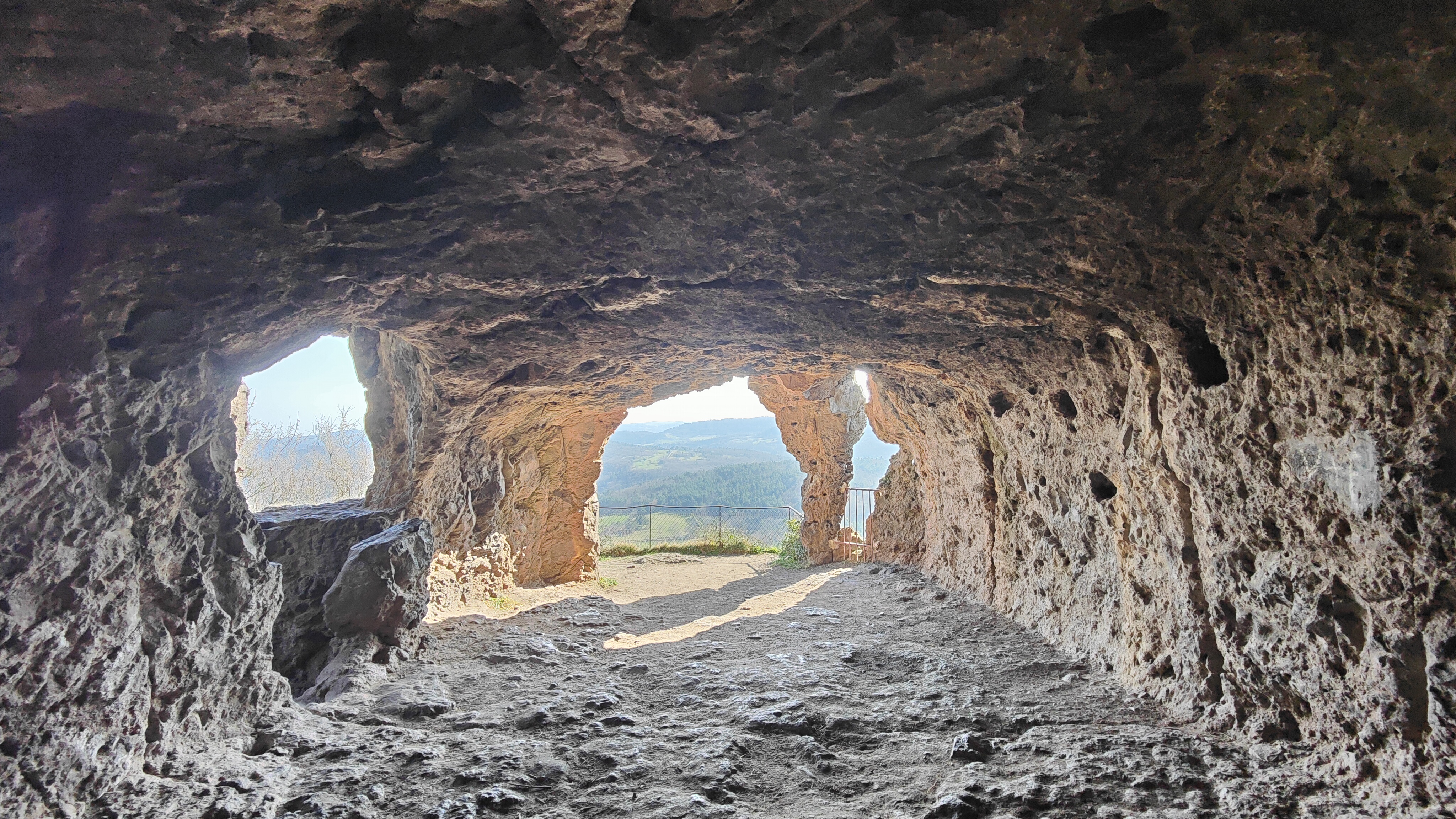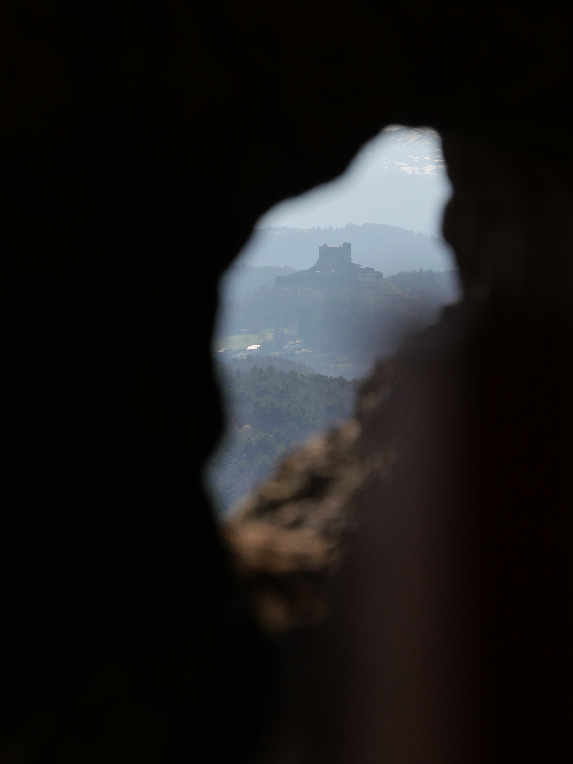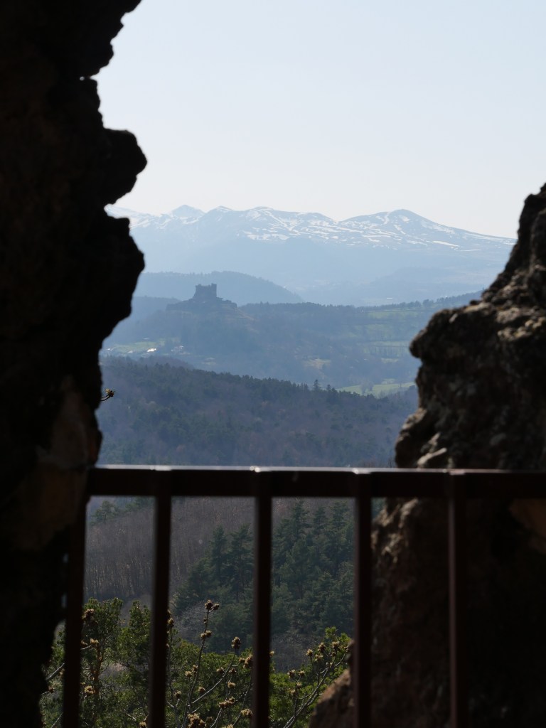 On démarre depuis le parking à côté des Grottes du Cornadore et on monte en direction de l’église, qui à elle seule vaut le coup d’œil. Considérée comme l’une des églises majeures de l’art roman auvergnat, elle surplombe le village avec majesté. On s’engouffre ensuite dans un petit chemin qui nous fait sortir du village et grimper tranquillement dans les sous-bois. A l’issue d’une belle montée, un panneau explicatif invite à s’avancer vers les grottes de Châteauneuf. Ce sont d’anciennes habitations troglodytiques, comme il y en a ailleurs dans le département (les grottes de Jonas par exemple, qui ne sont pas loin). De larges cavités peuvent s’explorer et elles s’ouvrent sur un panorama exceptionnel sur le Sancy et le château de Murol. Ma suggestion : prévoir le pique-nique pour déjeuner dans les grottes, vous serez à l’ombre s’il fait chaud et au sec s’il pleut ! C’est un site privé donc prenez-en soin, ne laissez rien derrière vous.