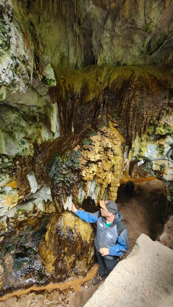 Coiffé d’un casque (les grottes sont basses de plafond), on évolue dans des boyaux et cavités humides où l’eau, petit à petit, façonne stalactites et stalagmites, et où le calcaire sculpte les reliefs. Des échelles de pétrification montrent ce travail de l’eau et du calcaire sur les objets disposés à des étages différents. On en retrouve un certain nombre à la boutique qui vient clôturer la visite. Je regrette de n’avoir pas craqué pour une vanité (un crâne)…