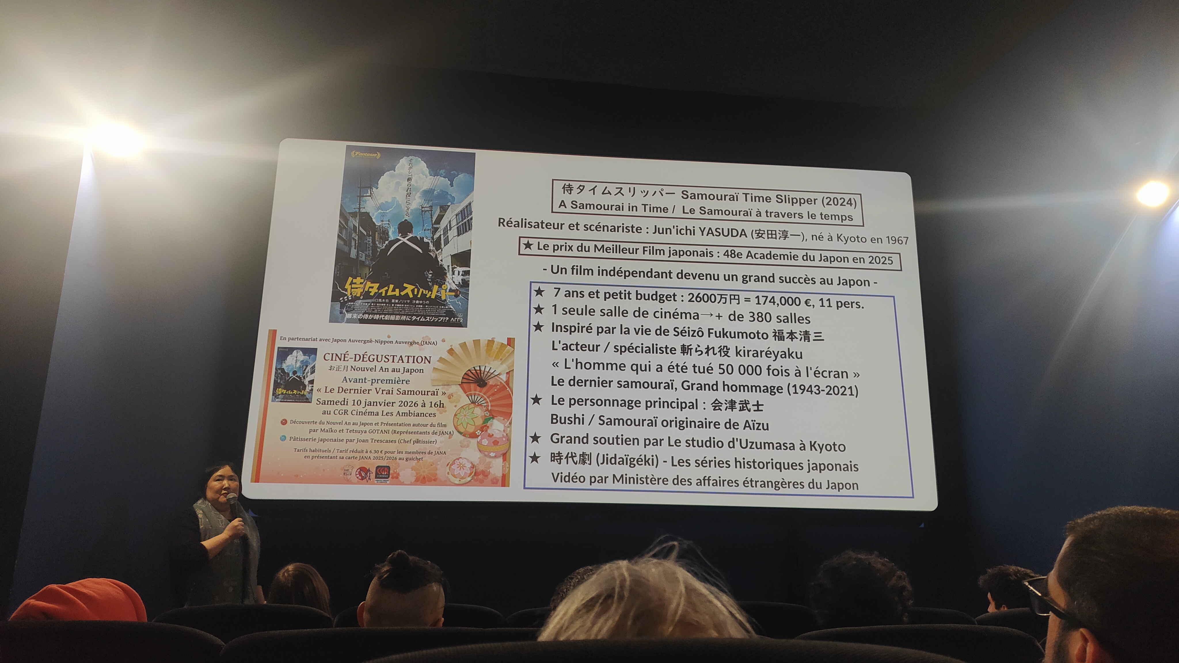 Le partenariat entre le cinéma Les Ambiances et l’association JANA – Japon Auvergne-Nippon Auvergne de mes amis Maïko et Tetsuya Gotani perdure dans le temps pour mon plus grand plaisir. Ils ont réussi à décrocher cette avant-première d’un film indépendant japonais qui ne sortira en France qu’en juin. Ce film humoristique nous raconte l’histoire d’un samouraï au XIXe siècle qui se retrouve parachuté dans le Japon moderne, sur le plateau de tournage d’un « jidaigeki« , film de genre très populaire dans le pays. Je vous rassure tout de suite, rien à voir avec Les Visiteurs ! Le propos ici est d’évoquer ce genre cinématographique, ses difficultés à se renouveler, les valeurs véhiculées dans les scénarios. Grâce à Maïko qui nous a fait une présentation du film et nous a diffusé un film institutionnel portant sur le jidaigeki, ses plateaux de tournage et l’importance du genre dans la culture japonaise, j’ai découvert avec plaisir et curiosité cette culture populaire autour des samouraïs.